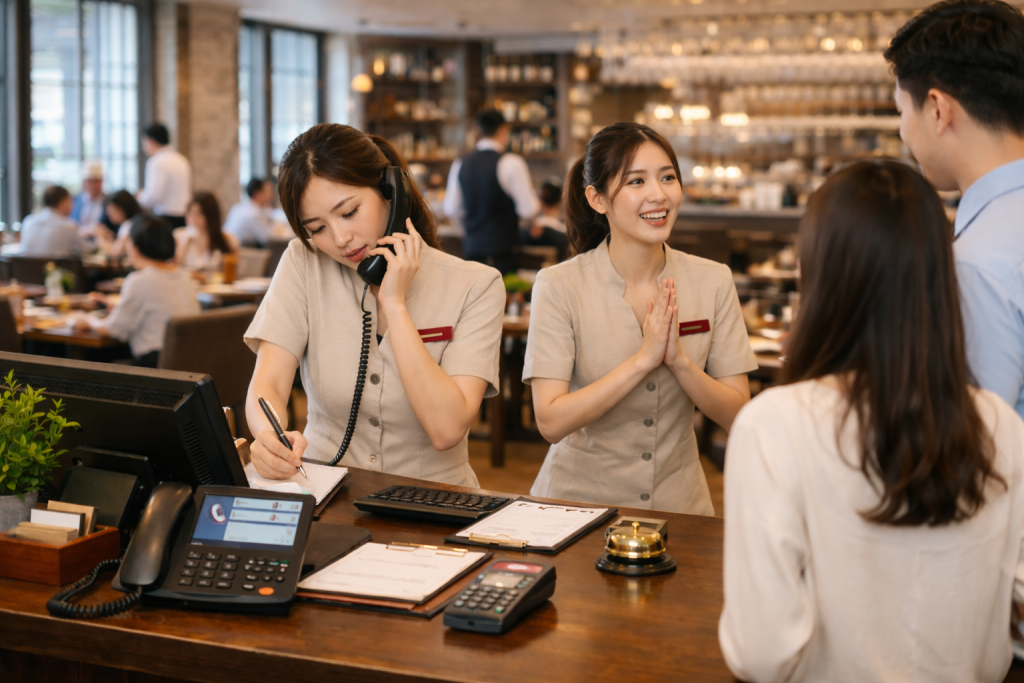 Trong quy trình vận hành nhà hàng, vị trí nhân viên lễ tân chính là bộ mặt của thương hiệu. Lễ tân không chỉ là người đầu tiên đón khách tại cửa mà còn là người trực hotline, nắm giữ “hơi thở” doanh thu của quán.