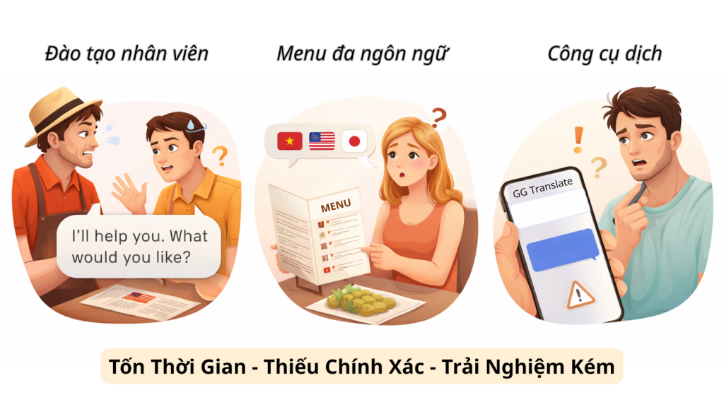 Không phải nhân viên nào cũng giao tiếp tốt bằng tiếng Anh, và càng khó khăn hơn khi khách hàng sử dụng các ngôn ngữ đặc thù như tiếng Hàn, tiếng Nhật, tiếng Trung hay tiếng Thái. Việc hiểu sai ý khách có thể dẫn đến những sự cố nhầm lẫn món ăn, gây ảnh hưởng nghiêm trọng đến hình ảnh nhà hàng.