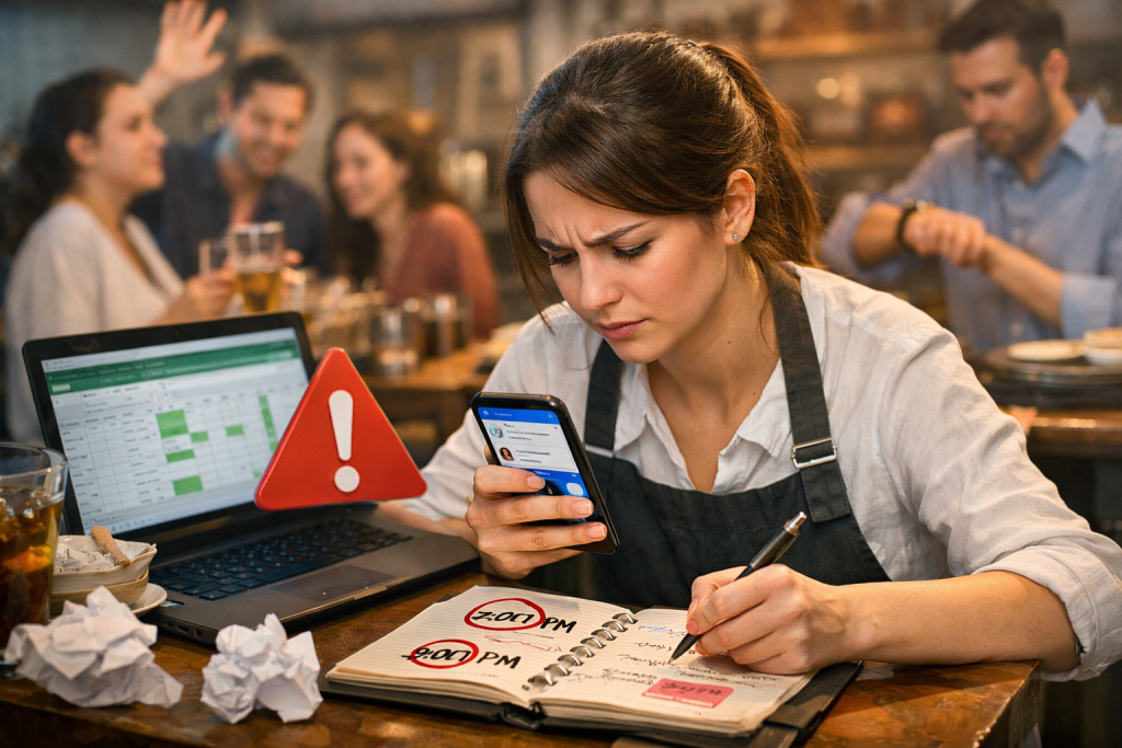- Dễ sai sót khi đông khách: Nhân viên vừa phục vụ vừa check tin nhắn rất dễ ghi nhầm giờ, nhầm bàn hoặc bỏ sót lịch của khách.