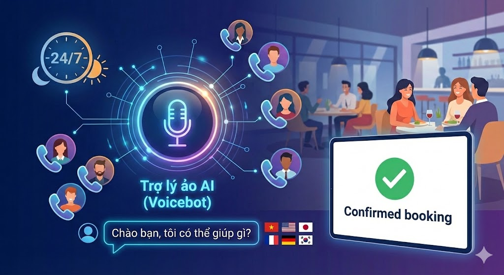 “Còn bàn không?”, “Giờ mở cửa?”, “Đặt bàn cho 4 người lúc 7h tối”.