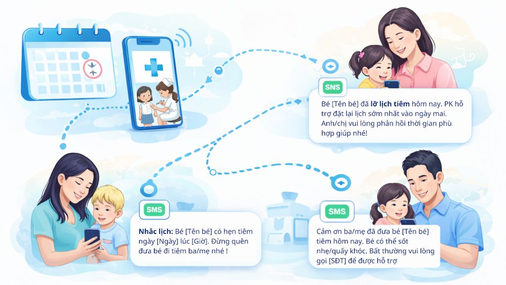 Trong lĩnh vực nhi khoa, việc nhắc lịch tiêm chủng đúng thời điểm không chỉ là quy trình y khoa mà còn là dịch vụ chăm sóc khách hàng trọng yếu. Thực tế, phụ huynh bận rộn rất dễ quên lịch, dẫn đến việc trễ mũi hoặc bỏ sót các cột mốc quan trọng cho sự phát triển của bé.
