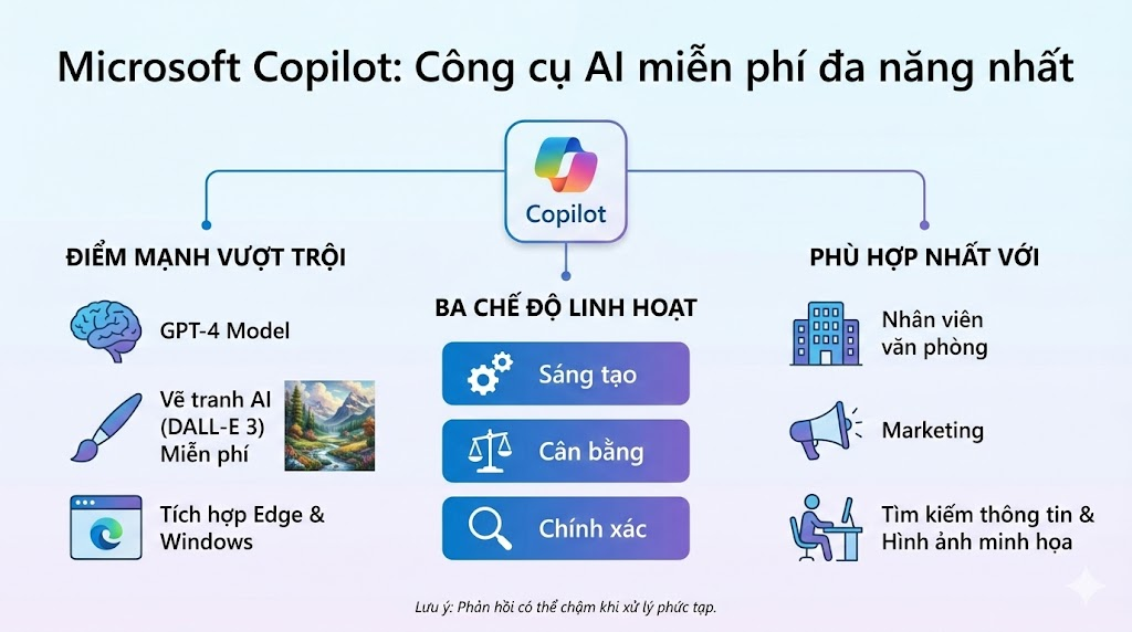 Đứng đầu danh sách chắc chắn là Copilot (trước đây là Bing Chat). Microsoft đã rất hào phóng khi tích hợp model GPT-4 và DALL-E 3 vào phiên bản miễn phí. Đây xứng đáng là công cụ AI miễn phí thay thế ChatGPT mạnh mẽ nhất dành cho dân văn phòng và sáng tạo.