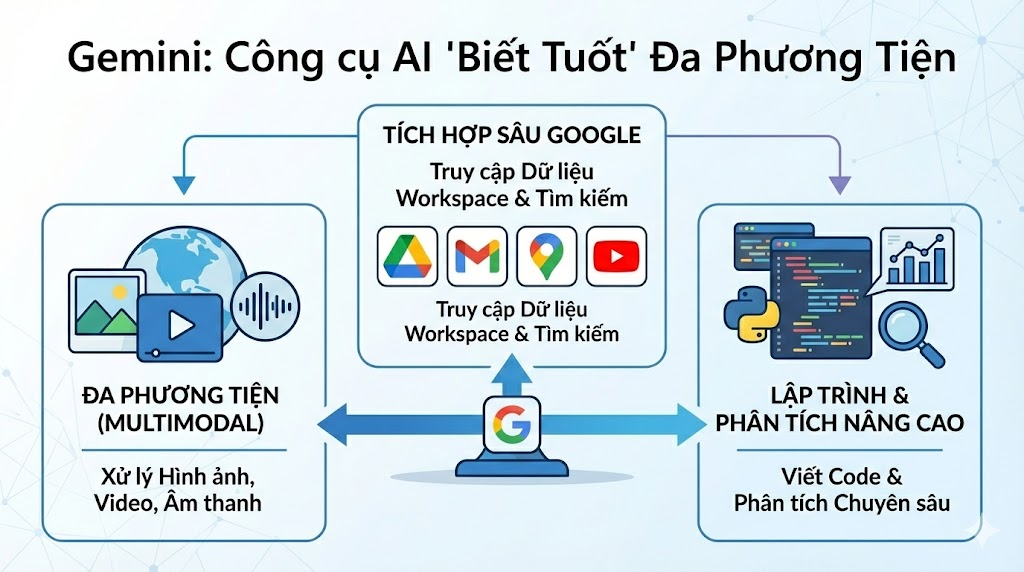 Google đã nâng cấp Gemini (trước đây là Bard) mạnh mẽ trong năm 2026 với các phiên bản 1.5 Pro và Flash. Lợi thế lớn nhất của Gemini nằm ở khả năng tích hợp sâu với hệ sinh thái Google như Docs, Gmail và Drive, giúp hỗ trợ hiệu quả các công việc hành chính và học tập. Đây là một lựa chọn đáng cân nhắc nếu bạn cần công cụ AI miễn phí thay thế ChatGPT cho các tác vụ văn phòng.