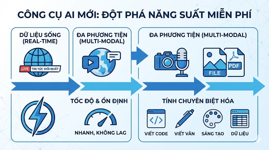 Nếu bạn vẫn đang dùng bản ChatGPT thường (GPT-3.5 hoặc GPT-4o mini) với dữ liệu bị giới hạn, bạn đang tự trói chân mình trong cuộc đua năng suất. Các công cụ AI miễn phí thay thế ChatGPT hiện nay đã vượt trội hơn rất nhiều nhờ các ưu điểm mang tính cách mạng: